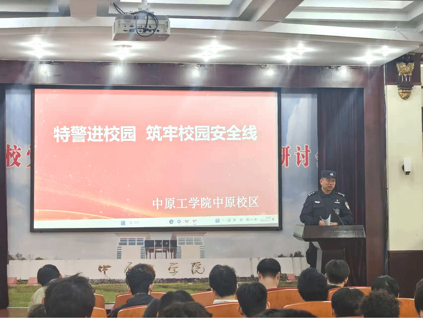 在图书馆报告厅进行活动启动仪式,中原校区管理委员会副主任、tyc234cc太阳成集团党委书记王雪芳和中原校区管理委员会执行主任、tyc234cc太阳成集团院长刘卫光出席会议并致辞。启动仪式后,特警支队的两名警官给学生进行校园防恐安全知识培训,结合近期全国校园安全典型案例,剖析涉校暴力事件特征与防范要点,让师生在沉浸式教学中增强风险识别与自救互救能力。